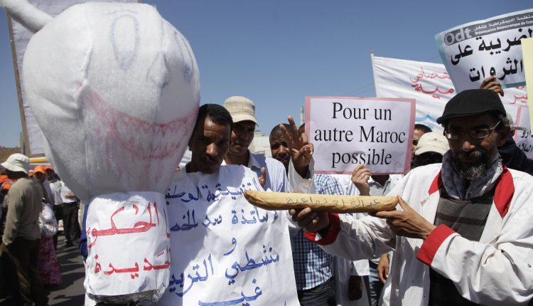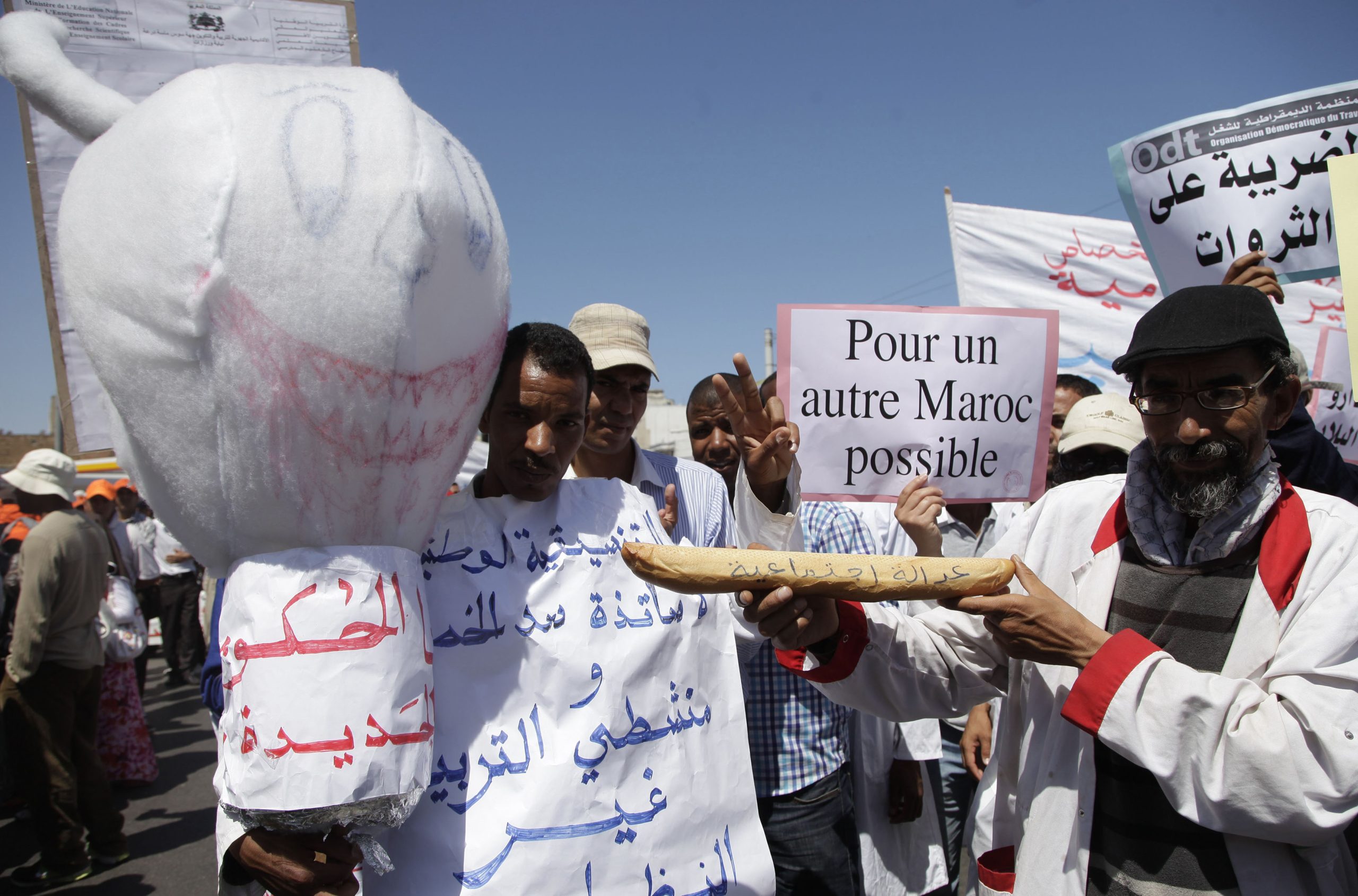 Demonstrators hold an effigy of the devil (L) and placards during a rally against rising prices in Rabat June 10, 2012. REUTERS/Stringer (MOROCCO - Tags: POLITICS CIVIL UNREST)