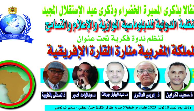بمناسبة تخليد الشعب المغربي للذكرى 48 لعيد المسيرة الخضراء المظفرة والذكرى 68 لعيد الإستقلال المجيد ،نظمت المنظمة الدولية للدبلوماسية الموازية والإعلام والتسامح يومه السبت 18 نونبر 2023 بالمركز الثقافي حسن الصقلي بسيدي البرنوصي ، ندوة بعنوان ” المملكة المغربية منارة القارة الإفريقية “ وقد ترأس هذه الندوة المصطفى بلقطيبية رئيس المنظمة.