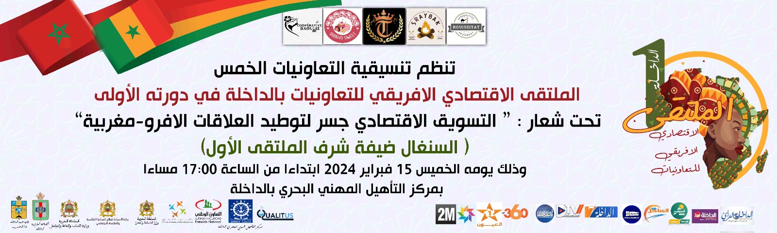 تحت شعار:”التسويق الاقتصادي جسر لتوحيد العلاقات الافرو- مغربية” ، نظمت تنسيقية التعاونيات الخمس : سريبك ، و صبايا سويت ، و الرويسيات ، و دوليز بيو ، و تاج الخليج ، النسخة الاولى للملتقى الاقتصادي الافريقي للتعاونيات بالداخلة ، بمركز التاهيل البحري ، يوم الخميس 15 فبراير 2024 ، و قد اختيرت لهذه الدورة دولة السينغال الشقيقة ضيف الشرف ، ٱعتبارا للعلاقات و الروابط المتينة التي تجمعها بالمملكة المغربية الشريفة، فضلا عن تواجد قنصليتها بحاضرة الداخلة ، التي تتواجد بها الجالية السينغالية الاكبر عددا مقارنة مع الجاليات الإفريقية المقيمة بالداخلة.