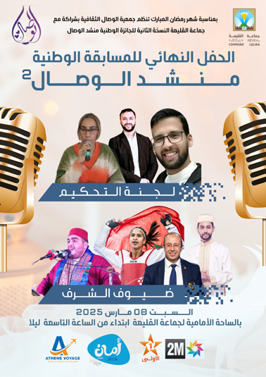 تنظم جمعية الوصال الثقافية بشراكة مع الجماعة الترابية القليعة والجماعة الترابية أيت ملول النسخة السادسة لمهرجان الوصال الوطني للمديح والسماع أيام 9.8.7 مارس 2025 بكل من مدينة القليعة وأيت ملول. وتعرف دورة هذه السنة تنظيم النسخة الثانية للمسابقة الوطنية منشد الوصال، حيث ستنظم الاقصائيات الأولى يوم 01 مارس بدار الشباب القليعة وتنظم الاقصائيات النهائية يوم 08 مارس في حفل كبير بالساحة المقابلة لجماعة القليعة. الإقصائيات النهائية ستعرف تباري عدد من الفرق الإنشادية والمنشدين والمنشدات للفوز بثلاث جوائز مالية للفرق تبلغ 10 ألف درهم وثلاث جوائز عينية للمنشديين والمنشدات الثلاث الفائزين. من جهة أخرى سيعرف الحفل النهائي للمسابقة تكريم البطلة العالمية أمينة دحاوي وإدريس الهلالي رئيس الجامعة الملكية المغربية للتايكواندو، وشخصيات أخرى. وعلى المستوى الأدبي والثقافي وفي إطار الأنشطة الموازية للمهرجان تنظم إدارة المهرجان بشراكة مع جماعة القليعة ليلة شعرية تجمع عدد من الشعراء والشاعرات والزجالين المغاربة في ليلة رمضانية كبرى بدار الشباب القليعة يوم 07 مارس 2025. وبمنصة أيت ملول تنظم جمعية الوصال الثقافية بشراكة مع جماعة أيت ملول الحفل الختامي لمهرجان الوصال الوطني للمديح والسماع الصوفي في دورته السادسة بمشاركة فرق وطنية فرقة حال رودانة لفن الملحون وفرقة البراءة للمديح والسماع وفرقة الوصال للمديح والسماع الصوفي. كما سيتم تكريم كل من القارئ العالمي إلياس المهياوي والمنشد معاذ بوكيوض الفائز بالجائزة العالمية منشد الشارقة والمنشد عبد الرحيم كوشول من تارودانت. وتعتبر الدورة السادسة لمهرجان الوصال الوطني للمديح والسماع الصوفي تظاهرة فنية دأبت الجمعية على تنظيمها سنويا قصد إحياء تراث المديح والسماع وأيضاً السعي لتقريب هذا الفن الراقي لأذواق كل عشاق الفن الملتزم والكلمة الموزونة والراقية. كما يندرج هذا المهرجان في إطار الإستراتيجية الرامية إلى ترسيخ الموروث الثقافي المغربي الأصيل بجميع تلاوينه وتجلياته.