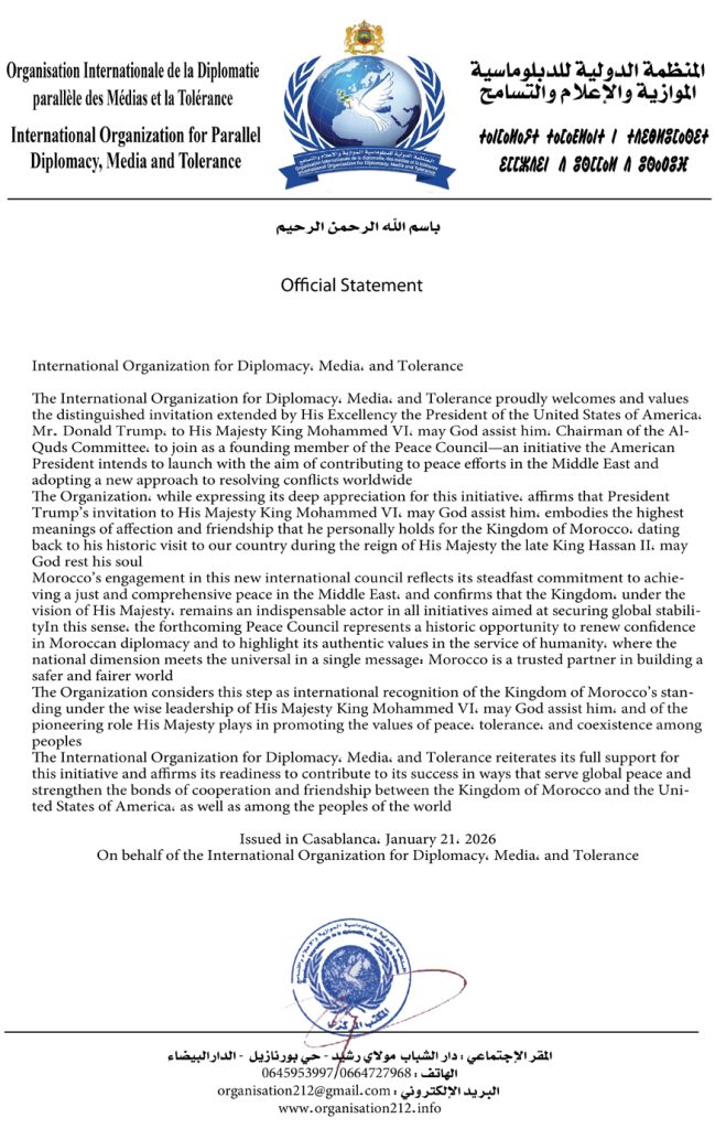 في أعقاب البلاغ الذي أصدرته المنظمة الدولية للدبلوماسية الموازية والإعلام والتسامح، والذي ثمّن الدعوة السامية الموجهة من فخامة الرئيس الأمريكي دونالد ترامب إلى صاحب الجلالة الملك محمد السادس، نصره الله، للانضمام كعضو مؤسس لمجلس السلام، تتأكد مرة أخرى المكانة المتميزة للمملكة المغربية في الساحة الدولية.