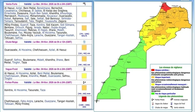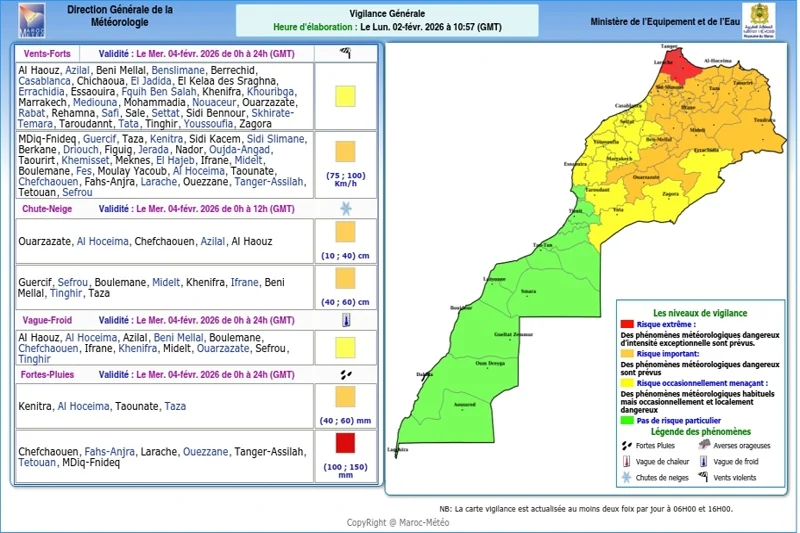 وتستهدف هذه التساقطات الاستثنائية بشكل مباشر، كلاً من عمالات وأقاليم: شفشاون، والمضيق-الفنيدق، وتطوان، وطنجة-أصيلة، ووزان، والعرائش، وفحص-أنجرة. وتبدأ هذه الظاهرة الجوية من منتصف ليل الأربعاء 04 فبراير 2026 وتستمر إلى غاية الساعة الحادية عشرة ليلاً من اليوم نفسه، وفق المعطيات التي اطلعت عليها جريدة هسبريس في النشرة المحينة على الساعة 11 و32 دقيقة صباح اليوم.