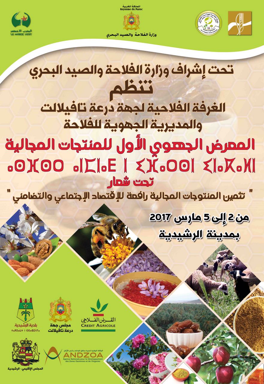 تحت إشراف وزارة الفلاحة و الصيد البحري وولاية جهة درعة تافيلالت ، تنظم الغرفة الفلاحية لجهة درعة- تافيلالت و المديرية الجهوية للفلاحة لجهة درعة- تافيلالت بشراكة مع الوكالة الوطنية لتنمية مناطق الواحات شجر الأركان ،المجلس الجهوي لجهة درعة تافيلالت، المجلس الإقليمي للراشيدية ،المجلس الجماعي للراشيدية والمديرية الجهوية للثقافة لجهة درعة تافيلالت ، المعرض الجهوي الأول للمنتجات المجالية تحت شعار ” تثمين المنتجات المجالية رافعة للاقتصاد الإجتماعي والتضامني” من 2 إلى غاية 5 مارس 2017 بالرشيدية.