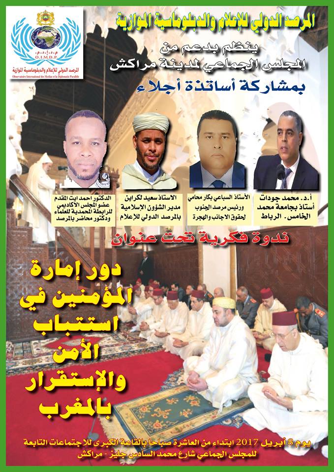 و اخلاصا منا للوطن و وفاء للعهد ينظم المرصد الدولي للاعلام و الدبلوماسية الموازية ندوة علمية بعنوان:”دور إمارة المؤمنين في استتباب الامن و الاستقرار بالمغرب.” مساهمة منا في ركب النماء و الشرف خلف أمير المؤمنين صاحب الجلالة الملك محمد السادس نصره الله.