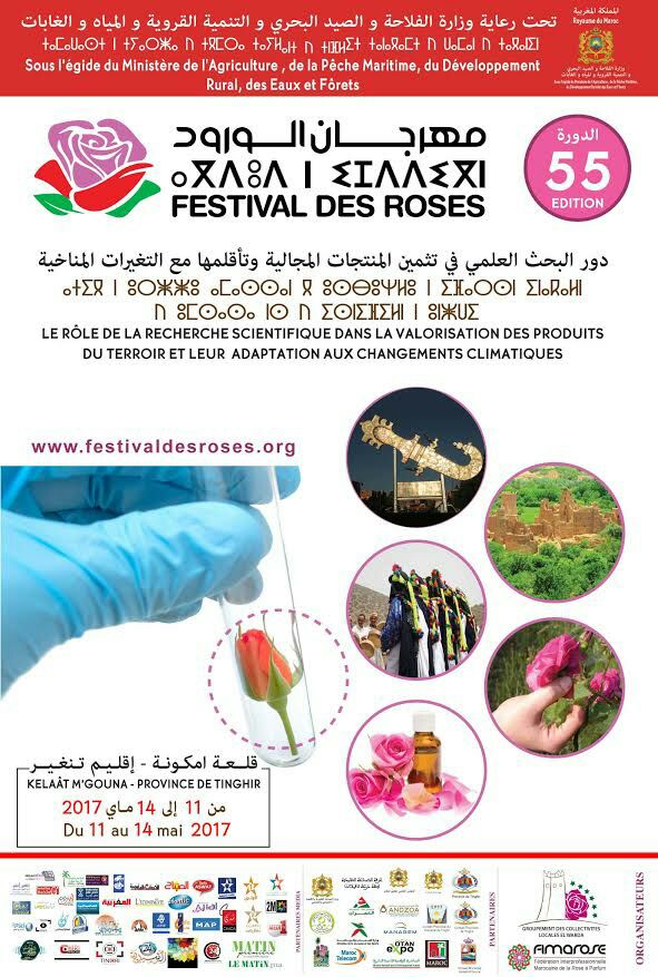 تحت رعاية وزارة الفلاحة والصيد البحري والتنمية القروية والمياه والغابات تنظم مجموعة جماعات الوردة والفيدرالية البيمهنية للورد العطري الدورة 55 لمهرجان الورود تحت شعار ” دور البحث العلمي في تثمين المنتجات المجالية وتأقلمها مع التغيرات المناخية” وذلك من 11 إلى 14 ماي 2017 بقلعة مكونة بشراكة ودعم من شركاء محليين وجهويين و وطنيين .