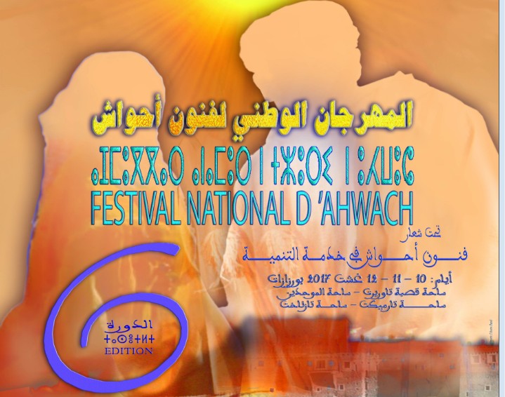 بمناسبة تربع صاحب الجلالة والمهابة الملك محمد السادس نصره الله على عرش أسلافه الميامين ، و احتفاء باليوم الوطني للمهاجر الذي يصادف 10 غشت وفي إطار العناية بالتراث الثقافي غير المادي والسعي المتواصل لتوفير سبل التعريف به والمحافظة عليه وتثمينه, ستنظم وزارة الثقافة والاتصال ـ قطاع الثقافة ـ ، بشراكة مع عمالة إقليم ورززات ، ومجلس جهة درعة تافيلالت ، والمجلس الإقليمي لورززات ، وجماعة ورززات والمجلس الإقليمي للسياحة وشركة ساسيم ، الدورة السادسة للمهرجان الوطني لفنون أحواش من 10 إلى 12 غشت 2017 بمدينة ورززات تحت شعار : ” فنون أحواش في خدمة التنمية ” ، وستعرف هذه الدورة مشاركة العديد من فرق موسيقى أحواش من مختلف مدن وجهات المملكة ، بالإضافة إلى ندوة فكرية تحت عنوان“ فنون أحواش بين الإبداع و التأصيل ” وأمسيات شعرية ، ومعارض فنية ومعرض للأزياء التقليدية المرتبطة برقصات فن أحواش وورشة صناعة الأدوات الموسيقية المستعملة في فن أحواش ،كما سيتم تكريم بعض رواد هذا الفن الأصيل عرفانا بعطائهم في التعريف بهذا التراث الثقافي اللامادي والحفاظ عليه.