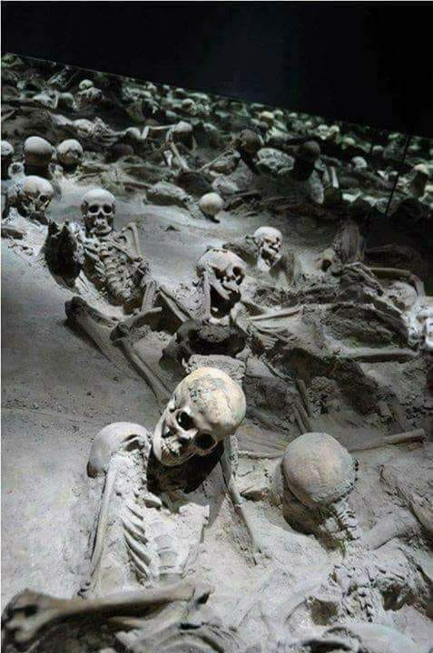 فقد احيطوا بموجة حارة من الرماد الملتهب تصل درجة حرارتها إلى 500 سيليزية، بصورة سريعة جداً حيث غطت 7 أميال إلى الشاطئ، وتظهر الجثث على هيئاتها وقد تحجرت الأجساد كما هي، فظهر بعضها نائم وآخر جالس وآخرون يجلسون على شاطئ البحر وبكل الأوضاع بشحمهم ولحمهم، وجد العلماء أنه لا توجد جثة واحدة يظهر عليها أي علامة للتأهب لحماية نفسها أو حتى الفرار، ولم يبد أحدهم أي ردة فعل ولو بسيطة، والأرجح أنهم ماتوا بسرعة شديدة دون أي فرصة للتصرف، وكل هذا حدث في أقل من جزء من الثانية.