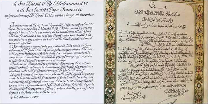 بمناسبة زيارة قداسة البابا فرنسيس للمملكة المغربية، فإن قداسته وصاحب الجلالة الملك محمد السادس، أمير المؤمنين، إقراراً منهما بوحدة القدس الشريف وحرمتها، وحفاظا على بعدها الروحي ومكانتها المتميزة كمدينة للسلام، قد اتفقا على إصدار النداء التالي :