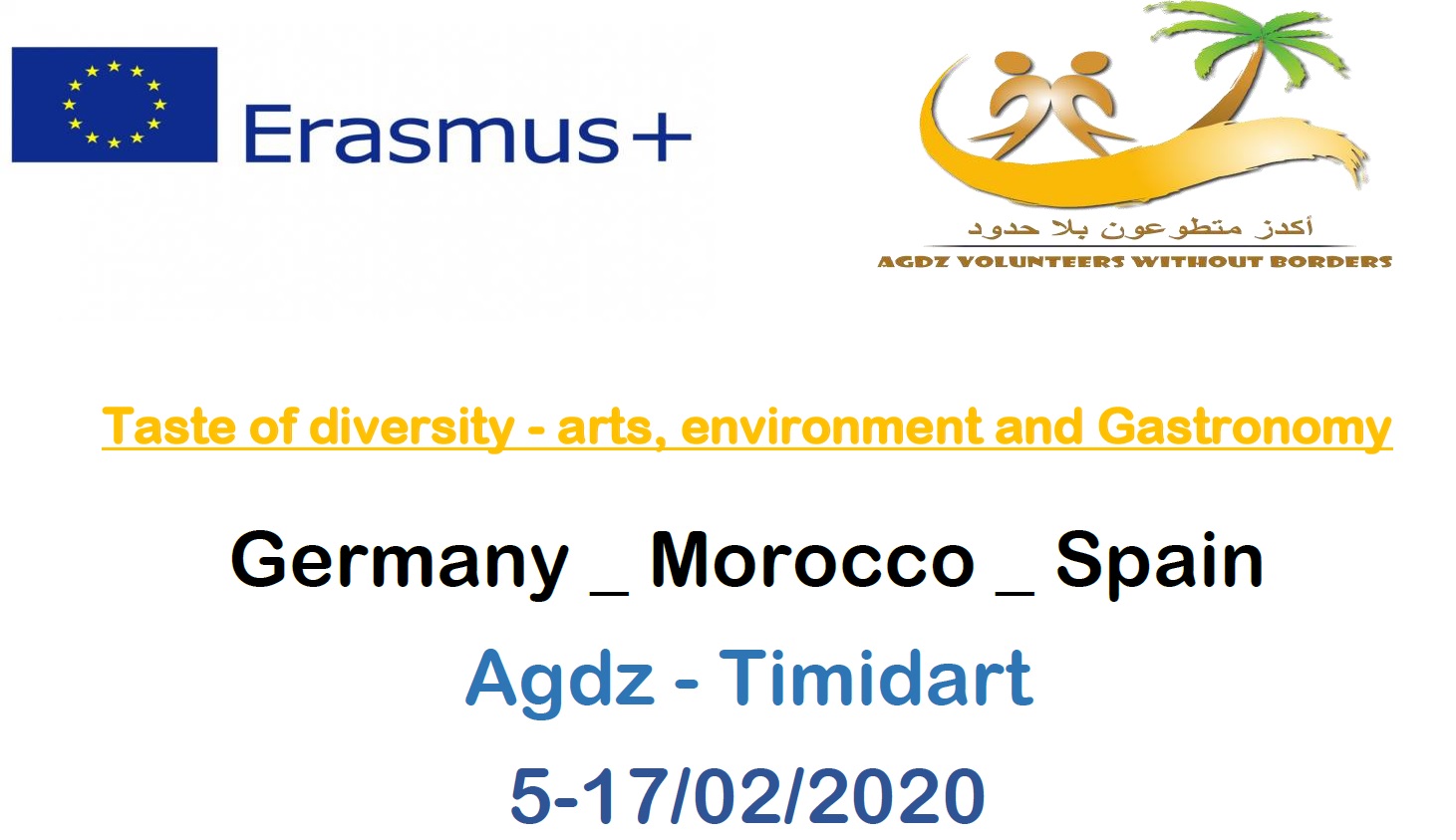 تستعد منظمة أكدز متطوعون بلا حدود لتنظيم التظاهرة الثالثة من برنامج التبادل الثقافي بين شباب الاتحاد الاوربي والمغرب من 5 الى 16 فبراير2020 بشراكة مع من مدرسة Omse e.v من المانيا وجمعية Asociación Socio-Cultural La Guajira لتقديم مشروع: Taste of diversity – arts, environment and Gastronomy بمشاركة 37 شاب وشابة من المانيا واسبانيا بالإضافة 16 شاب وشابة من المغرب يمثلون منطقتي اكدز وتيمضرت. ويأتي هذا المشروع في اطار اراسموس + Erasmus هو برنامج الاتحاد الأوروبي للتعليم والتدريب والشباب والرياضة في أوروبا. بميزانية تبلغ 14.7 مليار يورو ، يوفر لأكثر من 4 ملايين أوروبي إمكانية الدراسة ، التدريب واكتساب الخبرة في الخارج. لا يقتصر برنامج + Erasmus على الطلاب فقط فهو يجمع بين سبعة برامج سابقة ويخدم مجموعة واسعة من الأشخاص والمنظمات. يسهم Erasmus + في استراتيجية أوروبا 2020 للنمو والوظائف والعدالة الاجتماعية والإدماج ، وكذلك في أهداف الإطار الاستراتيجي “التعليم والتدريب 2020”. يهدف البرنامج إلى تعزيز التنمية المستدامة للدول الشريكة في مجال التعليم العالي والمساهمة في أهداف استراتيجية الاتحاد الأوروبي للشباب ويغطي البرنامج مجموعة المواضيع من بينها: البطالة، خاصة بين الشباب. تعزيز تعليم الكبار، وخاصة في مجال المهارات والمهارات الجديدة المطلوبة في سوق العمل. دعم الابتكار والتعاون والإصلاحات.