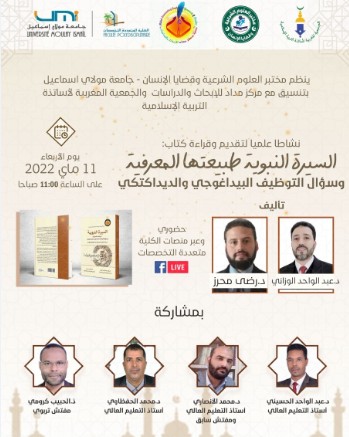 نظم مختبر العلوم الشرعية وقضايا الإنسان-جامعة مولاي إسماعيل-بتنسيق مع مركز مداد للأبحاث والدراسات والجمعية المغربية لأساتذة التربية الإسلامية نشاطا علميا بعنوان “قراءة في كتاب السيرة النبوية طبيعتها المعرفية وسؤال التوظيف البيداغوجي الديداكتيكي” من تأليف الأستاذين: الدكتور عبد الواحد الوزاني، والدكتور رضى محرز، وذلك يومه الأربعاء 11 ماي ابتداء من الساعة 11 صباحا بقاعة الندوات بالكلية متعددة التخصصات بالرشيدية، وعبر منصة الكلية وصفحاتها الرسمية على الفايسبوك.