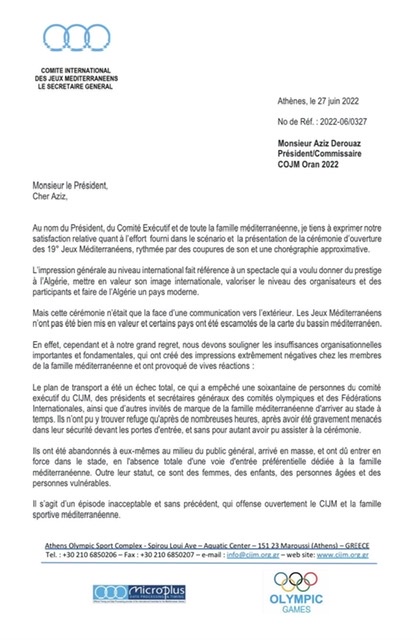 ووجه اليوناني إياكوفوس فيليبوسيس، الكاتب العام الجنة “CIJM”، رسالة شديدة اللهجة، إلى الجزائري عزيز درواز، رئيس الدورة المتوسطية “وهران 2022″، عددت مجموعة من الشوائب التي رافقت حفل الافتتاح، أبرزها عدم تسليط الضوء على الدورة المتوسطية، ناهيك عن إزاحة بعض الدول من خريطة الحوض المتوسطي، كما حصل مع المغرب.