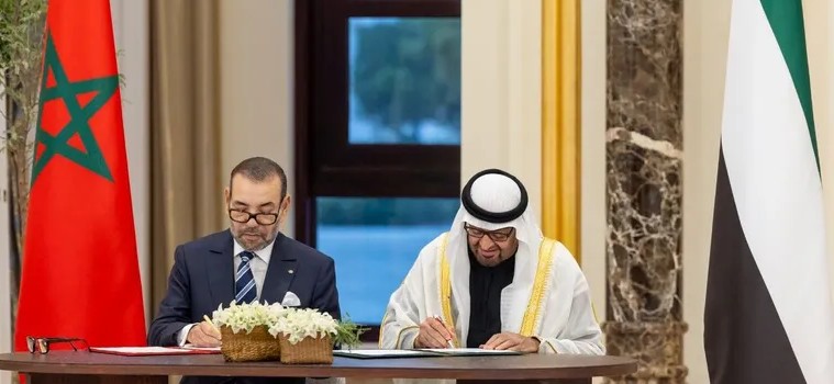 كما تبادل الجانبان ـ خلال مراسم جرت في قصر الوطن في أبوظبي عدداً من مذكرات التفاهم شملت التالي : 1 ــ مذكرة تفاهم بشأن إرساء شراكة استثمارية في مشاريع القطار فائق السرعة في المملكة المغربية.. تبادلها من جانب دولة الإمارات سهيل بن محمد فرج فارس المزروعي وزير الطاقة والبنية التحتية ومن جانب المغرب محمد ربيع لخليع رئيس المكتب الوطني للسكك الحديدية. 2 ــ مذكرة بشأن شراكة استثمارية في قطاع الماء تبادلها من جانب دولة الإمارات.. سهيل بن محمد فرج فارس المزروعي، ومن الجانب المغربي نزار بركة وزير التجهيز والماء. 3 ــ مذكرة حول شراكة إنمائية..تبادلها محمد حسن السويدي وزير الاستثمار ومن جانب المغرب فوزي لقجع الوزير المنتدب لدى وزيرة الاقتصاد والمالية المكلف بالميزانية. 4 ــ مذكرة تفاهم بين آدنوك والمكتب الشريف للفوسفات (OCP) .. تبادلها من جانب دولة الإمارات محمد حسن السويدي وزير الاستثمار..ومن الجانب المغربي مصطفى التراب المدير العام للمكتب الشريف للفوسفات. 5ــ مذكرة بشأن شراكة استثمارية في مشاريع قطاع الطاقة تبادلها سهيل بن محمد فرج فارس المزروعي و ليلى بنعلي وزيرة الانتقال الطاقي والتنمية المستدامة في المغرب. 6 ــ مذكرة بشأن شراكة استثمارية في قطاعي الفلاحة والصيد البحري تبادلها.. مريم بنت محمد سعيد حارب المهيري وزيرة التغير المناخي والبيئة ومن جانب المغرب محمد صديقي وزير الفلاحة والصيد والبحري والتنمية القروية والمياه والغابات. 7 ــ مذكرة بشأن تعاون استثماري في قطاع المطارات تبادلها محمد حسن السويدي وزير الاستثمار و محمد عبد الجليل وزير النقل واللوجيستيك المغربي. 8 ــ مذكرة تفاهم للتعاون الاستثماري في قطاع الموانئ ..تبادلها محمد حسن السويدي ومن الجانب المغربي نزار بركة وزير التجهيز والماء. 9 ــ مذكرة بشأن إرساء شراكة استثمارية مرتبطة بمشروع “أنبوب الغاز المغرب ـ نيجيريا ” تبادلها من جانب دولة الإمارات سهيل بن محمد فرج فارس المزروعي و أمينة بنخضرة مديرة المكتب الوطني للهيدروكاربورات والمعادن في المغرب. 10 ــ مذكرة للتعاون المشترك في قطاع “الأسواق المالية وسوق الرساميل”، تبادلها محمد حسن السويدي وزير الاستثمار و نادية فتاح وزيرة الاقتصاد والمالية. 11 ــ مذكرة تفاهم بشأن شراكة استثمارية في مجال السياحة والعقار..تبادلها محمد حسن السويدي و محسن جازولي الوزير المنتدب لدى رئيس الحكومة المكلف بالاستثمار. 12 – مذكرة بشأن إرساء شراكة استثمارية في مشاريع تخزين المعلومات..تبادلها من جانب دولة الإمارات محمد حسن السويدي ومن الجانب المغرب محسن جازولي الوزير المنتدب لدى رئيس الحكومة المكلف بالاستثمار.