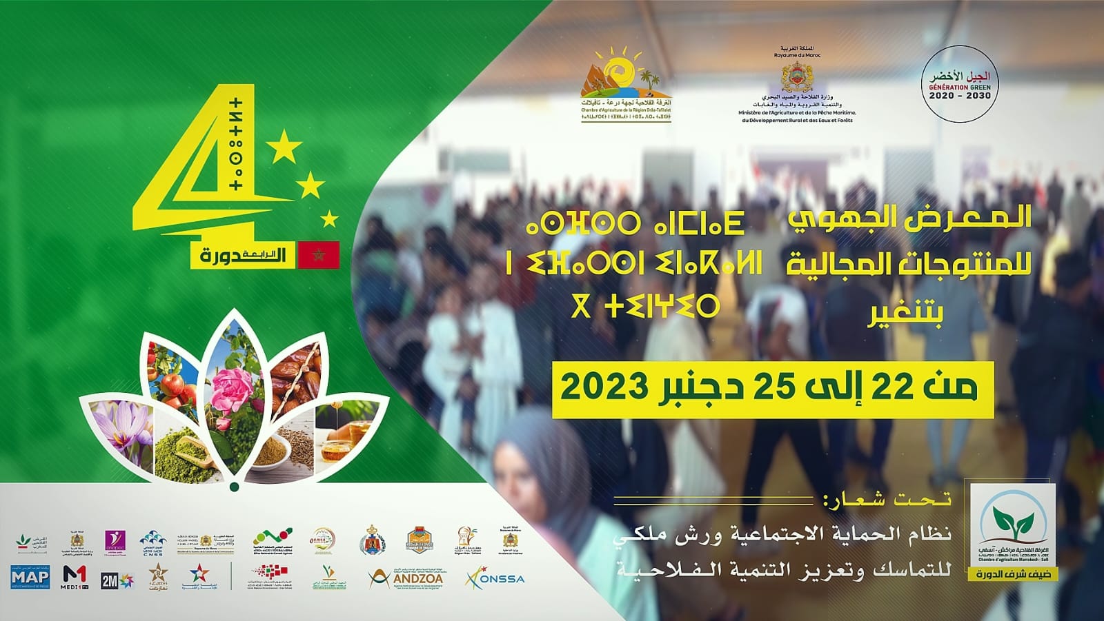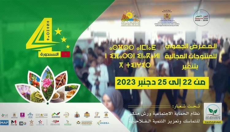 إيمانا منها بالدور الريادي والفعال، الذي تضطلع به كل مكونات المجال الفلاحي، من فلاحين وجمعيات وتعاونيات فلاحية وكل المنتسبين للغرف الفلاحية بأقاليم جهة درعة تافيلالت، وقطاع وصي ومتدخلين، ومن أجل النهوض بالمنتوجات المجالية التي تساهم بشكل فعال في الاقتصاد المحلي والوطني، تعتزم الغرفة الفلاحية لجهة درعة تافيلالت، وتحت إشراف وزارة الفلاحة والصيد البحري والتنمية القروية والمياه والغابات، وبشراكة مع ولاية جهة درعة تافيلالت وعمالة إقليم تنغير والمديرية الجهوية للفلاحة وشركاء اخرون، تنظيم الدورة الرابعة للمعرض الجهوي للمنتوجات المجالية بتنغير، تحت شعار: “نظام الحماية الاجتماعية ورش ملكي للتماسك وتعزيز التنمية الفلاحية” خلال الفترة الممتدة ما بين 22 و25 من دجنبر 2023 بمدينة تنغير.