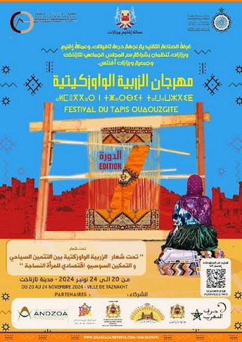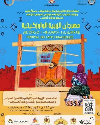 تحت شعار“الزربية الواوزكيتية بين التثمين السياحي والتمكين السوسيو-اقتصادي للمرأة النساجة” .، تنظم غرفة الصناعة التقليدية لجهة درعة تافيلات و عمالة إقليم ورزازات بشراكة مع المجلس الجماعي لتازناخت وجمعية ورزازات إيفينت، وذلك بهدف الاحتفاء بهذا الإرث الثقافي الأصيل وتسليط الضوء على دور المرأة النساجة في التنمية الاقتصادية المحلية.مهرجان الزربية الواوزكيتية في نسخته السابعة من 20 إلى 24 نونبر 2024، بتازناخت التى تبعد حوالي 90 كلم غرب مدينة ورزازات