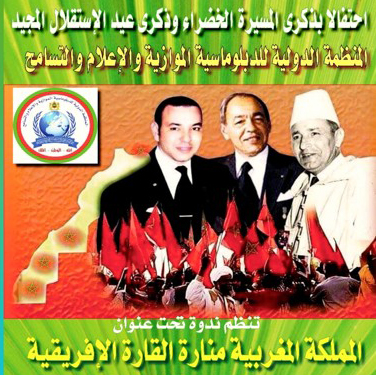 بمناسبة تخليد الشعب المغربي للذكرى 49 لعيد المسيرة الخضراء المظفرة والذكرى 69 لعيد الإستقلال المجيد ،نظمت المنظمة الدولية للدبلوماسية الموازية والإعلام ندوة بعنوان ” المملكة المغربية منارة القارة الإفريقية.