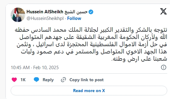 وفي رسالة شكر نشرها أمين سر اللجنة التنفيذية لمنظمة التحرير الفلسطينية، عبر حسابه على منصة “X”، قال الشيخ: “أوجه بالشكر والتقدير الكبير لجلالة الملك محمد السادس حفظه الله على جهدهم المتواصل في حل أزمة الأموال الفلسطينية المحتجزة لدى إسرائيل، ونثمن هذا الجهد الأخوي المستمر في دعم صمود وثبات شعبنا على أرض وطنه”.