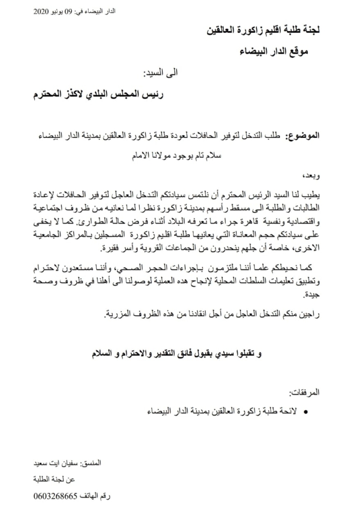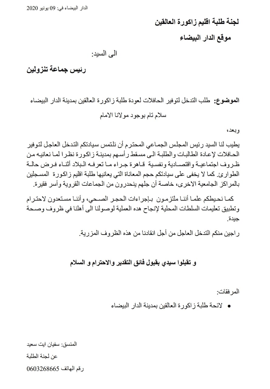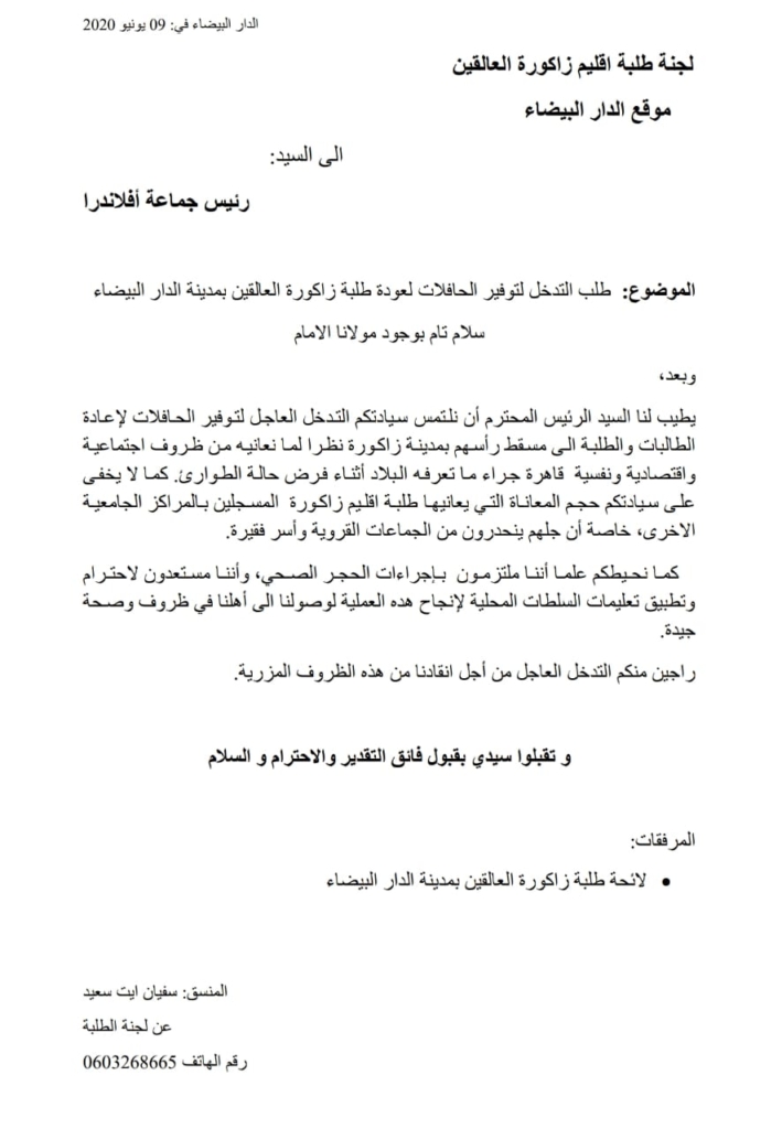 وجه مجموعة من الطلبة والطالبات المنحدرين من إقليم زاكورة والعالقين بمدينة الدار البيضاء بفعل حالة الطوارئ والحجر الصحي المفروض بالبلاد من أجل التصدي لجائحة كورونا نداء استغاثة للجهات المسؤولة بالإقليم عبر رسائل وجهت إلى عمالة الإقليم وإلى رؤساء المجالس المنتخبة من أجل انقادهم ونقلهم من الدارالبيضاء في اتجاه بلدتهم على غرار الطلبة من أبناء بلدتهم المستفيدين من عملية إعادة من مراكش واكادير.