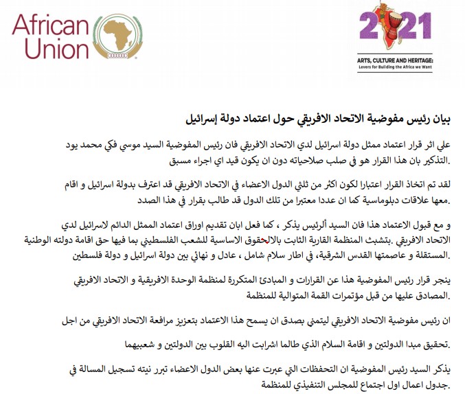 وأبرز بيان صحفي صادر عن مفوضية الاتحاد، أنه “على إثر قرار اعتماد ممثل دولة إسرائيل لدى الاتحاد الإفريقي، فإن رئيس مفوضية الاتحاد الإفريقي موسى فقي محمد يود التذكير بأن هذا القرار هو في صلب صلاحياته دون أن يكون قيد أي إجراء مسبق” .