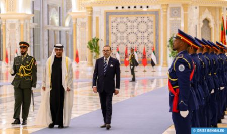 Abou Dhabi – Un accueil officiel a été réservé, lundi au Palais présidentiel « Qasr Al Watan » à Abou Dhabi, à Sa Majesté le Roi Mohammed VI, que Dieu L’assiste, par Son Altesse Cheikh Mohammed Ben Zayed Al-Nahyane, Président de l’Etat des Emirats Arabes Unis (EEAU).