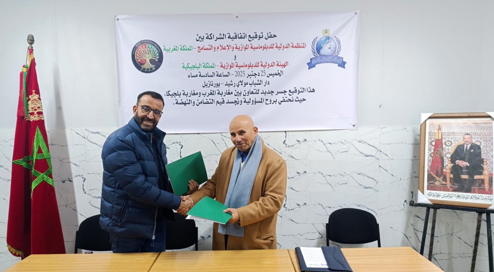 Dans une atmosphère empreinte de fierté et de fraternité, la Maison des Jeunes Moulay Rachid – Bournazil a accueilli, le jeudi 25 décembre 2025, un événement d’une portée exceptionnelle : la signature d’un accord de partenariat stratégique entre l’Organisation Internationale de la Diplomatie Parallèle, des Médias et de la Tolérance, basée au Royaume du Maroc, et l’Instance Internationale de la Diplomatie Parallèle, établie au Royaume de Belgique. Cet acte solennel marque une étape nouvelle dans le cheminement commun des deux institutions et adresse un message clair : la diplomatie parallèle est capable de bâtir des ponts solides entre les peuples, de renforcer les valeurs de solidarité et de porter l’élan de la renaissance.