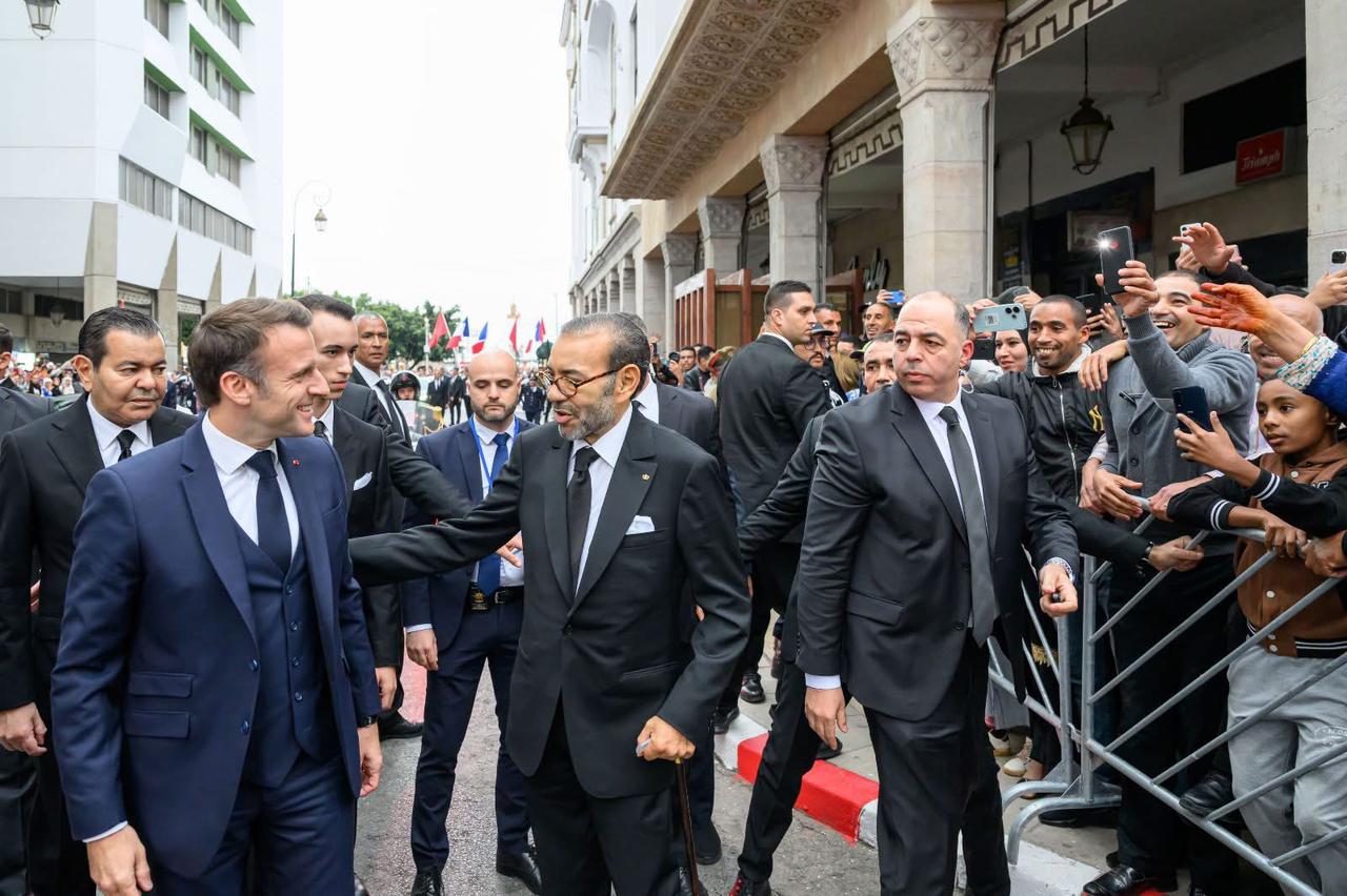A la Place du Méchouar, le Président français Emmanuel Macron a été salué par le Chef du gouvernement, les présidents des deux Chambres du Parlement, les Conseillers de SM le Roi, le Président délégué du Conseil supérieur du pouvoir judiciaire, Premier-Président de la Cour de Cassation, le procureur général du Roi près la Cour de Cassation, président du ministère public, les membres du gouvernement, le Haut-Commissaire au Plan, le Haut-Commissaire aux Anciens Résistants et Anciens membres de l’Armée de Libération, le président de la Cour Constitutionnelle, la présidente de la Cour des Comptes, le Président du Conseil économique, social et environnemental, le secrétaire général du Conseil supérieur des Oulémas, le Président du Conseil supérieur de l’éducation, de la formation et de la recherche scientifique, la présidente du Conseil national des droits de l’Homme, le Médiateur du Royaume, la présidente de la Haute autorité de la communication audiovisuelle, le président du Conseil de la Concurrence, le président de l’Instance Nationale de la Probité, de la Prévention et de la Lutte contre la Corruption, le président du Conseil Royal consultatif pour les affaires sahariennes et le chambellan de SM le Roi.